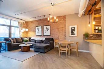 Rarely available original builder's model, showcases the brick & timber construction in Regal Lofts in Lincoln Park! This unit offers high-end upgrades and a sought-after open floor plan. There are 2 side-by-side deeded exterior parking spots available for $25K each. The stunning 2-bedroom, 2-bath loft features exposed brick and timber beams, hardwood floors, and abundant natural light from oversized windows. An open-concept living/dining area flows seamlessly into a quality finished kitchen with custom countertops, 42" oak cabinetry with glass doors, tile backsplash, black-finished appliances, and a breakfast bar-perfect for everyday living and entertaining. The bright living room is anchored by a remote-start gas fireplace with a sleek dark metal surround and mosaic tile accent wall, creating a modern-industrial focal point. French doors open to the Juliet balcony to combine indoor comfort and the outdoor summer breeze to complete the space. The fully enclosed primary suite offers a massive walk-in closet, plush carpeting, exposed brick, and an en-suite bath with a double vanity featuring unique, hexagon vessel sinks and a tub/shower combo with custom, light tile. The second bedroom includes exposed brick, plush carpeting, and a custom built-in oak desk, ideal for a home office. A second full bath off the main hallway features a tub/shower with high-end custom tile and a circular vessel sink. Additional features include generous linen and coat closet space, in-unit washer/dryer, dedicated storage, Nest Thermostat. Regal Lofts is a well-managed, pet-friendly elevator building with an exercise room, dog run, ButterflyMX intercom system, guest parking, and on-site management. Ideally located near I-90/94, the Diversey Brown Line, bus routes, parks, Midtown Athletic Club, Whole Foods, Costco, and local favorites like Hexe Coffee. An opportunity to own in Lincoln Park-one of Chicago's most desirable areas, steps from shopping, and premier dining.